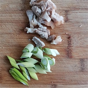 2、我用的熟的五花肉,最好用瘦肉末,葱切成葱花,是不是有点大,这都是我姑娘不爱吃,每次都得挑出来的