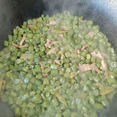 6、表面汤汁收的差不多,放调味料,煸炒至没有汤汁,芸豆熟了后,可以出锅,出锅前可放蒜末,我没放