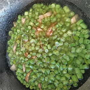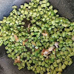 4、用一点点酱油把肉调颜色,可以不放,再加入切好的芸豆,煸炒变色,一定要变色