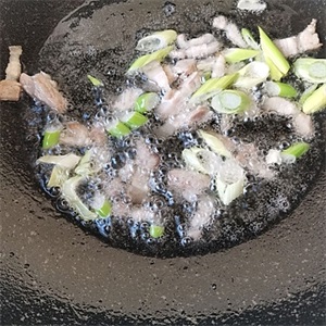 3、锅内倒油,因为是熟的五花肉,所以葱,五花肉一起下锅,要是肉末,就先肉末变色放葱花哦