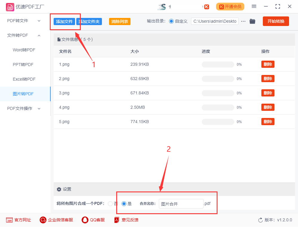 步骤二:点击【添加文件】蓝色按钮,添加我们要合并的图片文件到软件里;然后在软件最下面选择“将所有图片合并成一个pdf”。