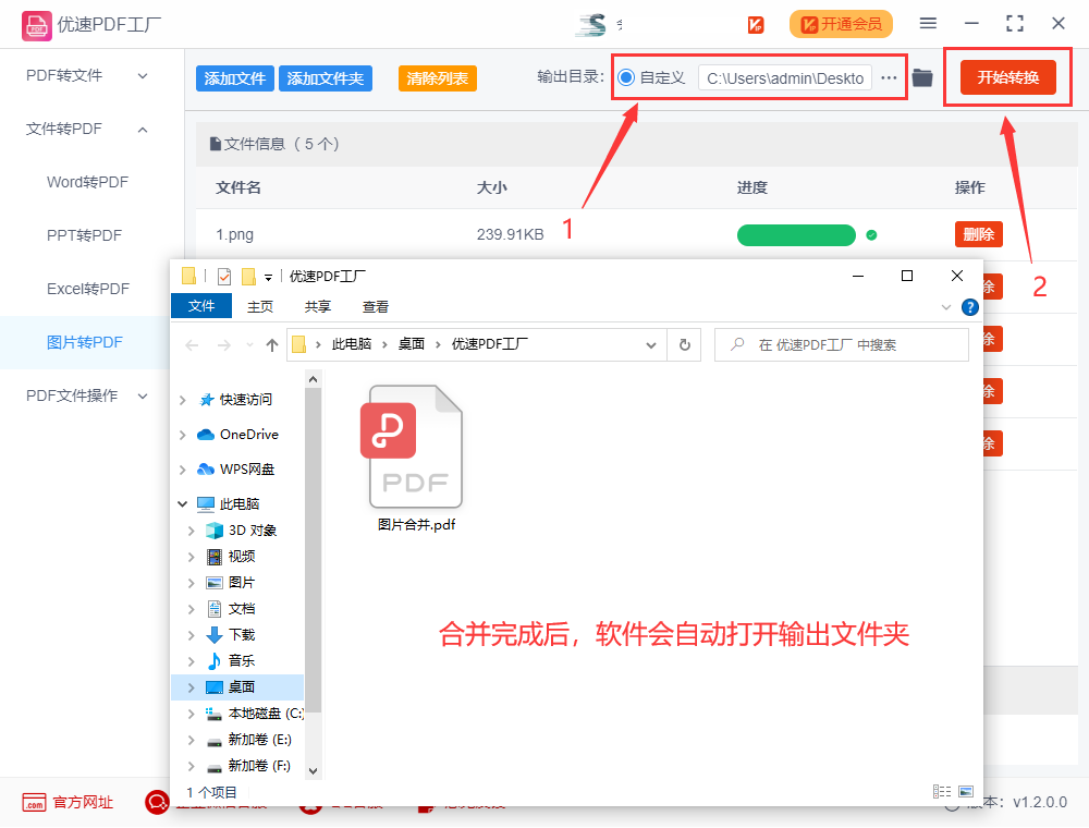 步骤三:在软件右上方输出目录位置,设置合并后的pdf文件保存文件夹;设置完毕后,点击【开始转换】,此时软件开始启动合并程序;当合并完成后,软件自动打开刚才我们设置的输出文件夹,我们可以看到合并好的pdf文件就保存在里面。