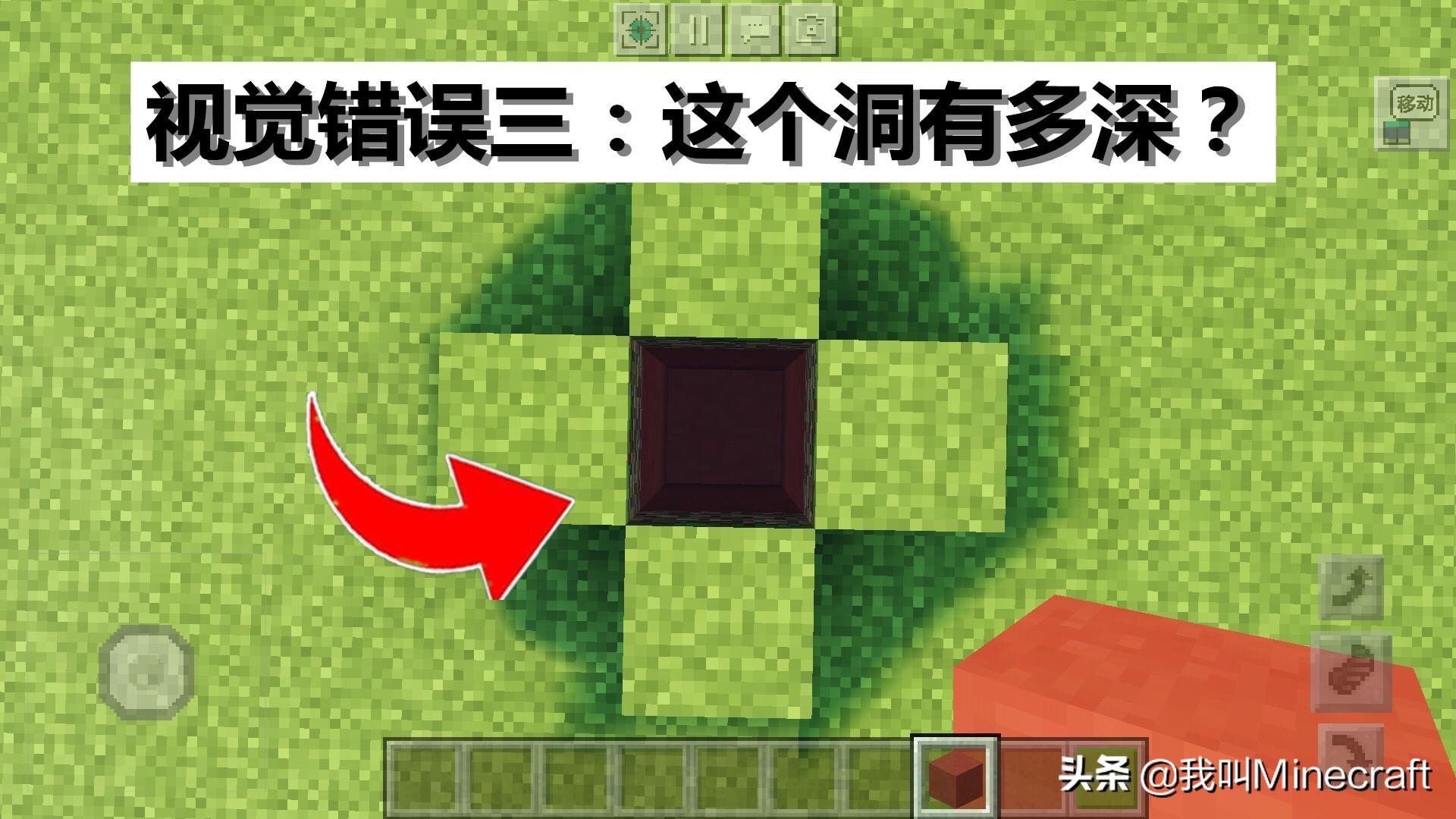 深度错觉的意思就是,《我的世界》玩家有时候在判断只有1格宽的洞穴时,其实是无法准确的判断这个洞的深度。不信的话,你判断一下图片中的这个洞有多深?其实产生视觉错误的主要原因是洞内没有过多的阴影和纹理来判断,我们用了单一色彩的红色陶瓦铺在了底部,让人误以为非常浅,看上去,加上草方块也只有2格深罢了!
