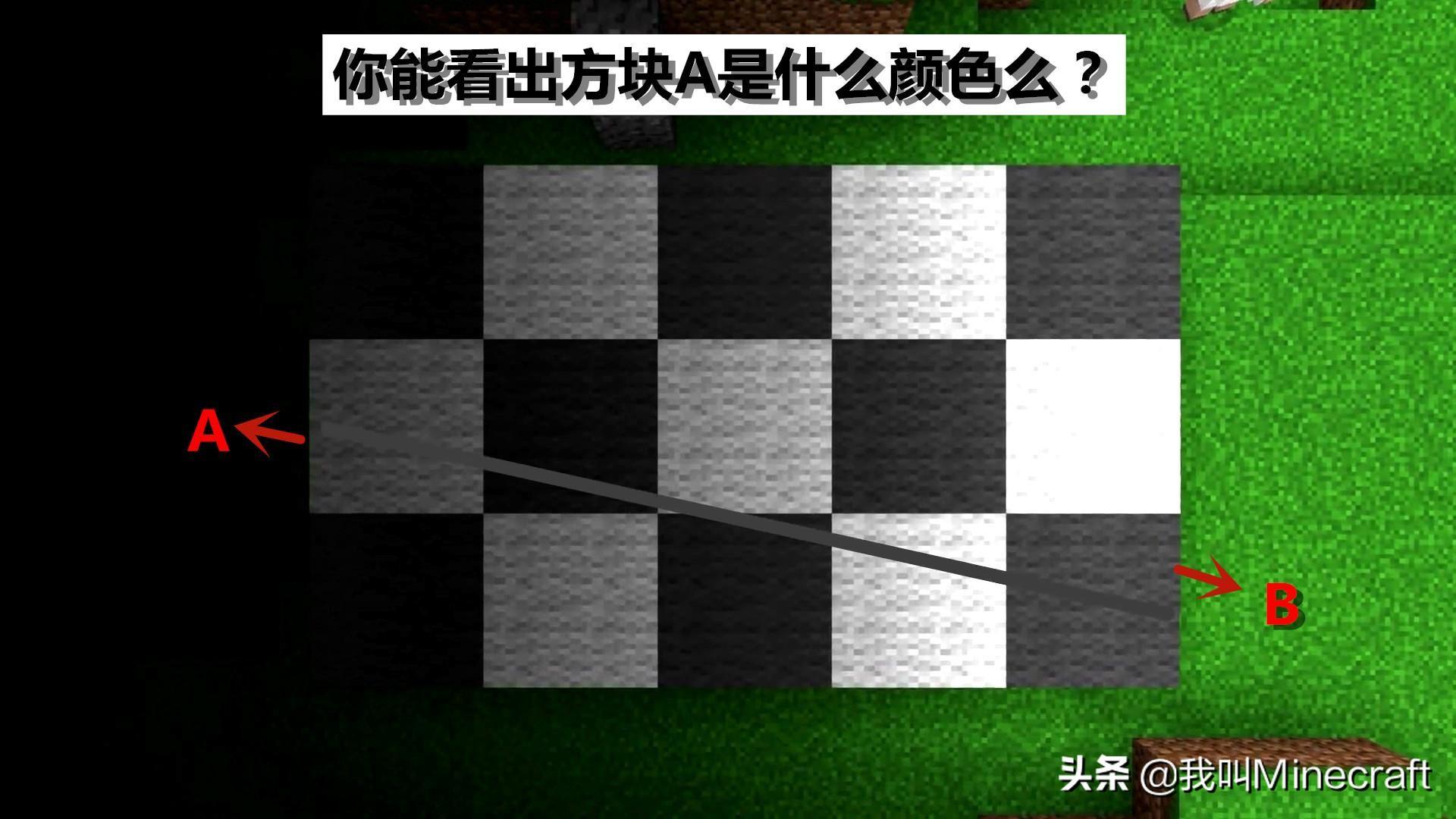 如图所示,用羊毛方块摆成的一个类似国际象棋的棋盘。因为《我的世界》光影存在的变化,左半部分实际上是位于山洞下方的。故光影有了一个由明到暗的过程。正常来说,我们看A方块,基本上能判断出它是一个白色方块,对吧。如果你这么认为,就错了!