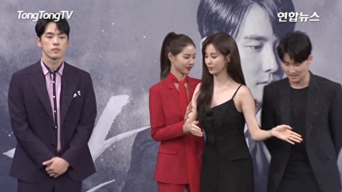 两位主角拍照时的互动亦相当奇怪,在4人合照时,金正贤故意将女配角黄胜妍拉到自己和徐贤中间,但黄胜妍可能觉得不妥,又自动换位要他俩站一起,此时可看出不管站哪个姿势,他都刻意与徐贤保持距离,甚至还一度拉导演站在他俩中间。