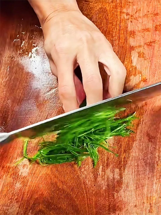 7、现在是蒸鱼的时间,我们可以来切葱丝,先从尾部把葱卷起来用手压结实就可以开切了。动作要快,姿势要帅,小心不要出意外,然后再切上姜丝和红椒丝