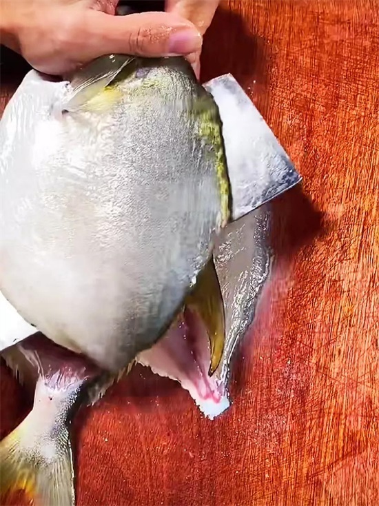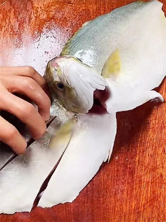 1、首先准备一条金鲳鱼杀好清理干净,然后将鱼进行改刀。先从鱼两边的尾部往上慢慢地推开,然后将鱼身的骨头给它切开出来。