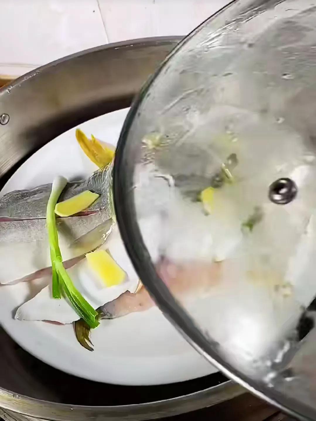 9、这时候我们的鱼也蒸好了,打开盖子把蒸出来多余的水倒掉,然后把葱段和葱片夹出来不要。