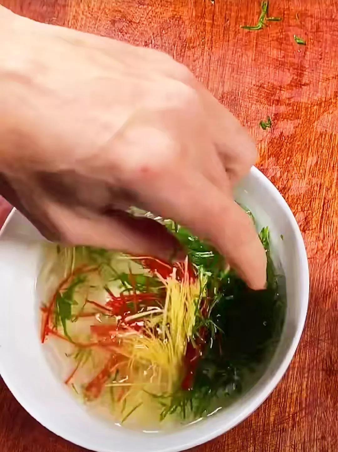 8、全部切好后放进碗中泡一下水,泡水是为了更好看,而且保持新鲜,这就是所谓的蒸鱼三丝了。