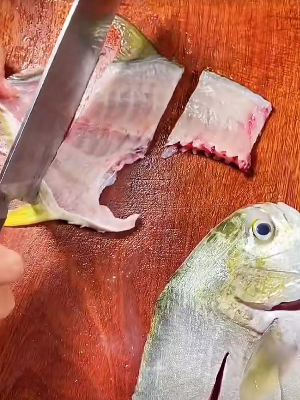 2、骨头切出来后,把鱼平铺在暗板上,然后再把鱼的身上两面都划上两刀。