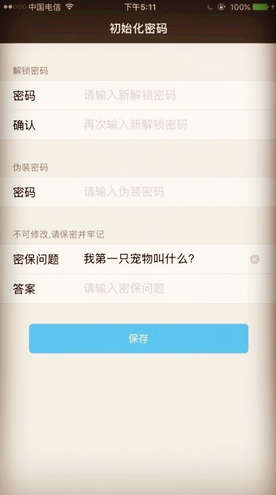 2、第一次打开软件需要初始化设置,输入解锁密码、伪装密码、密保答案。密保答案一定要记住,最好选择只有你一个让你知道的答案。