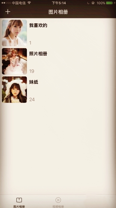 3、你可以创建多个图片或视频相册以便分类,进入相册后点击右上角的加号导入照片。
