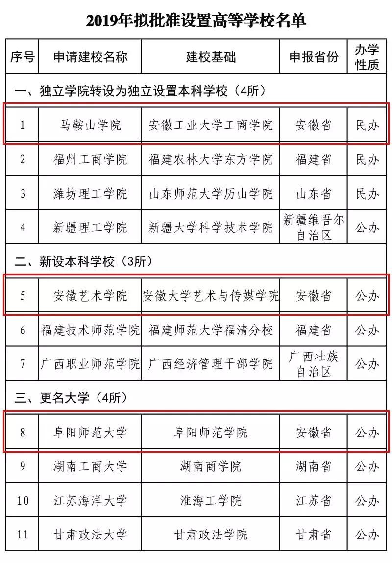 独立学院转设为独立设置本科学校中,安徽工业大学工商学院将设置为马鞍山学院;新设本科学校中,安徽大学艺术与传媒学院将设置为安徽艺术学院;更名大学中,阜阳师范学院将设置为阜阳师范大学。