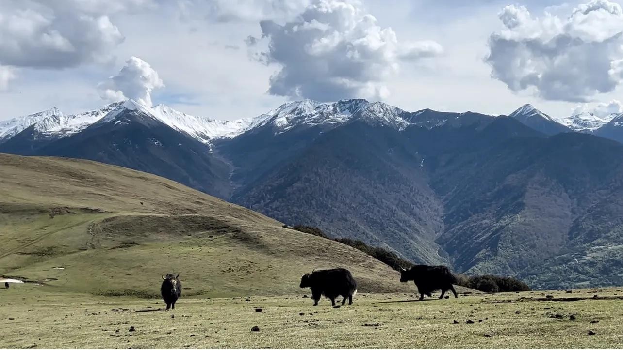 山顶的视野很开阔,四周是连绵、壮观的雪山,成群的牦牛在吃草。正所谓登高才能望远,诚不欺人也。