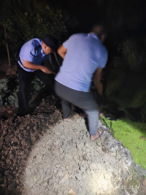 现场,在草丛深处确实传来微弱的“救命”声。民警遂与村民一同利用照明设备四处搜寻,最终在水塘的一偏僻处,发现了一名身陷泥潭的老人。此时,老人的大部分身体已陷入泥泞当中!