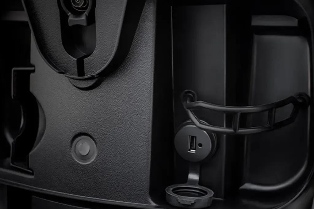 虽然是封闭储物空间,但是,通过细节也可以看出里面的诚意。充电接口甚至连水杯架都配置了,这确实体现了细节的设计。