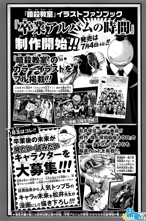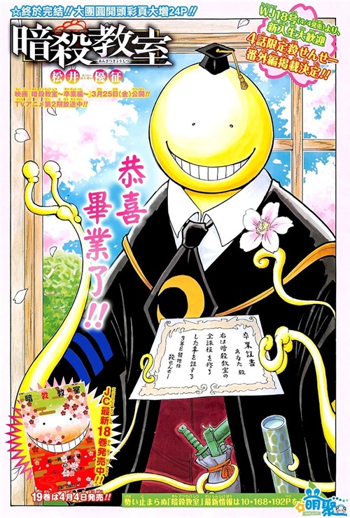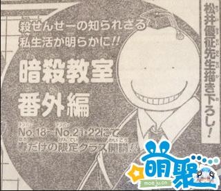 《暗杀教室》本篇正式完结,4 月份将推出四周的番外漫画,将于JUMP第18号~21·22号集中连载,番外漫画主要讲述的是杀老师平时私人生活的故事,例如杀老师平时都吃什么食物之类的。