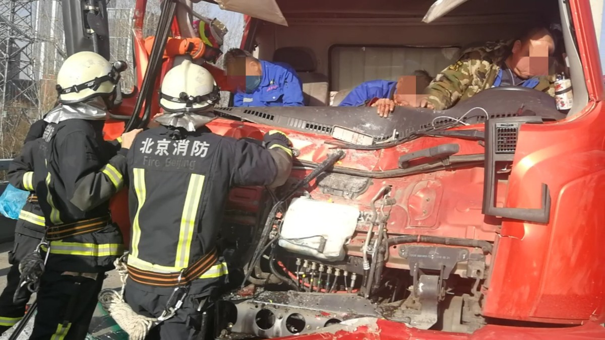 今天中午,京承高速进京方向距北七家桥约300米处,发生一起5车连环追尾事故。其中一辆货车驾驶室严重损毁,三名人员被困。昌平消防指战员经过20分钟的紧张救援,3名被困人员被成功救出,两人腿部受伤,生命体征均正常。