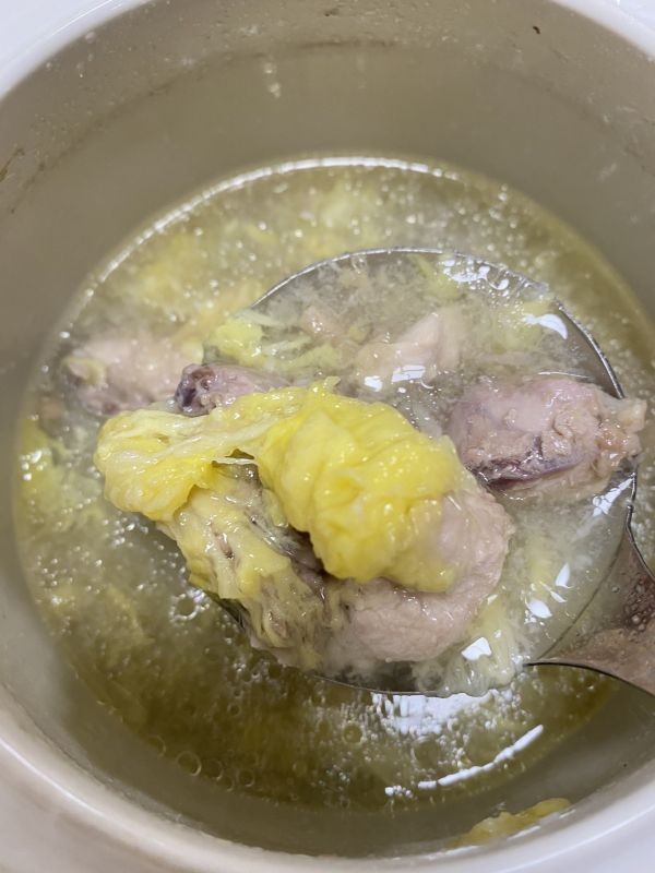 4、原图无滤镜的榴莲鸡汤,口感比较香甜。 有需要的可以放枸杞红枣一起煲。