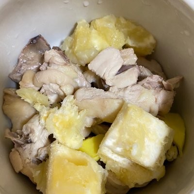榴莲壳 三小块儿鸡肉 适量盐 适量榴莲肉 三块儿生姜 5片