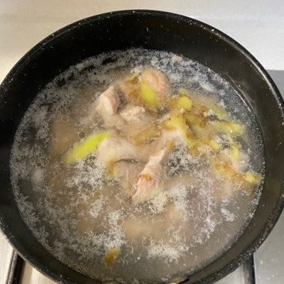 1、将鸡肉洗净冷水下锅,加入生姜去腥味。焯水~ 将鸡肉的血沫煮出来,然后用凉水冲洗干净。(血沫要煮出来要洗干净,不然会影响汤的口感)