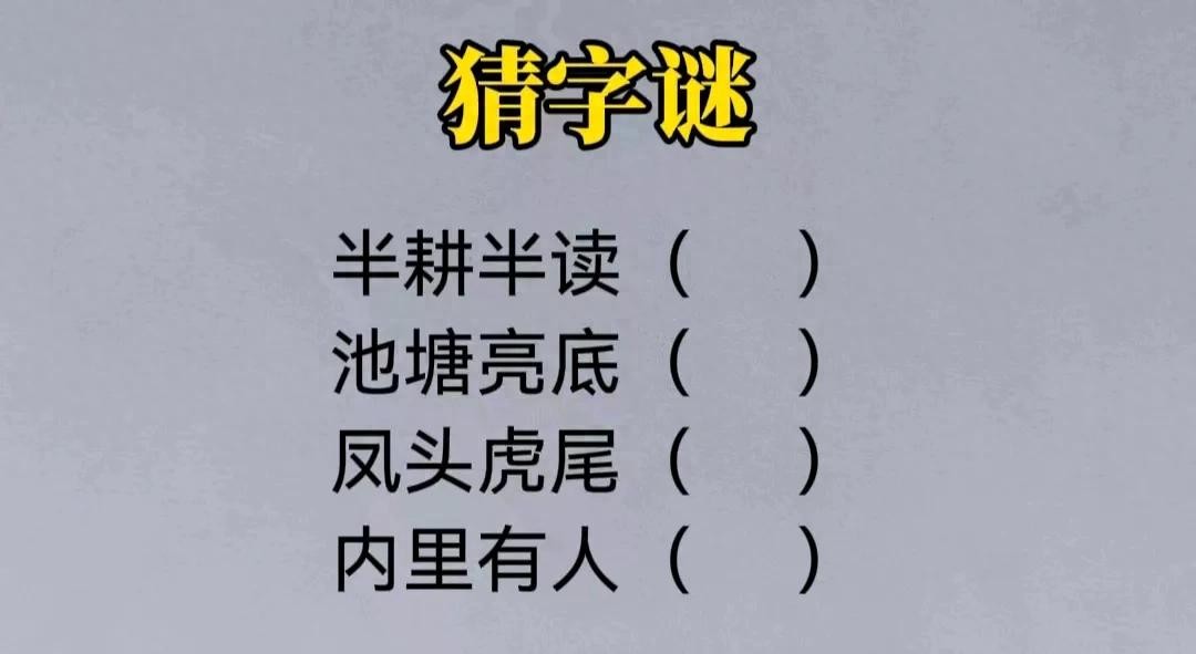 猜字谜:半耕半读,池塘亮底,凤头虎尾,内里有人?猜一猜