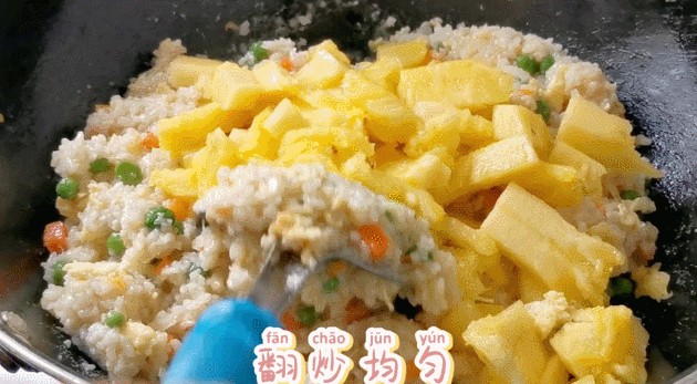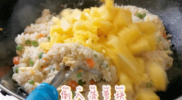 加入菠萝块(如果不想菠萝饭太湿润,菠萝汁可以不倒入)