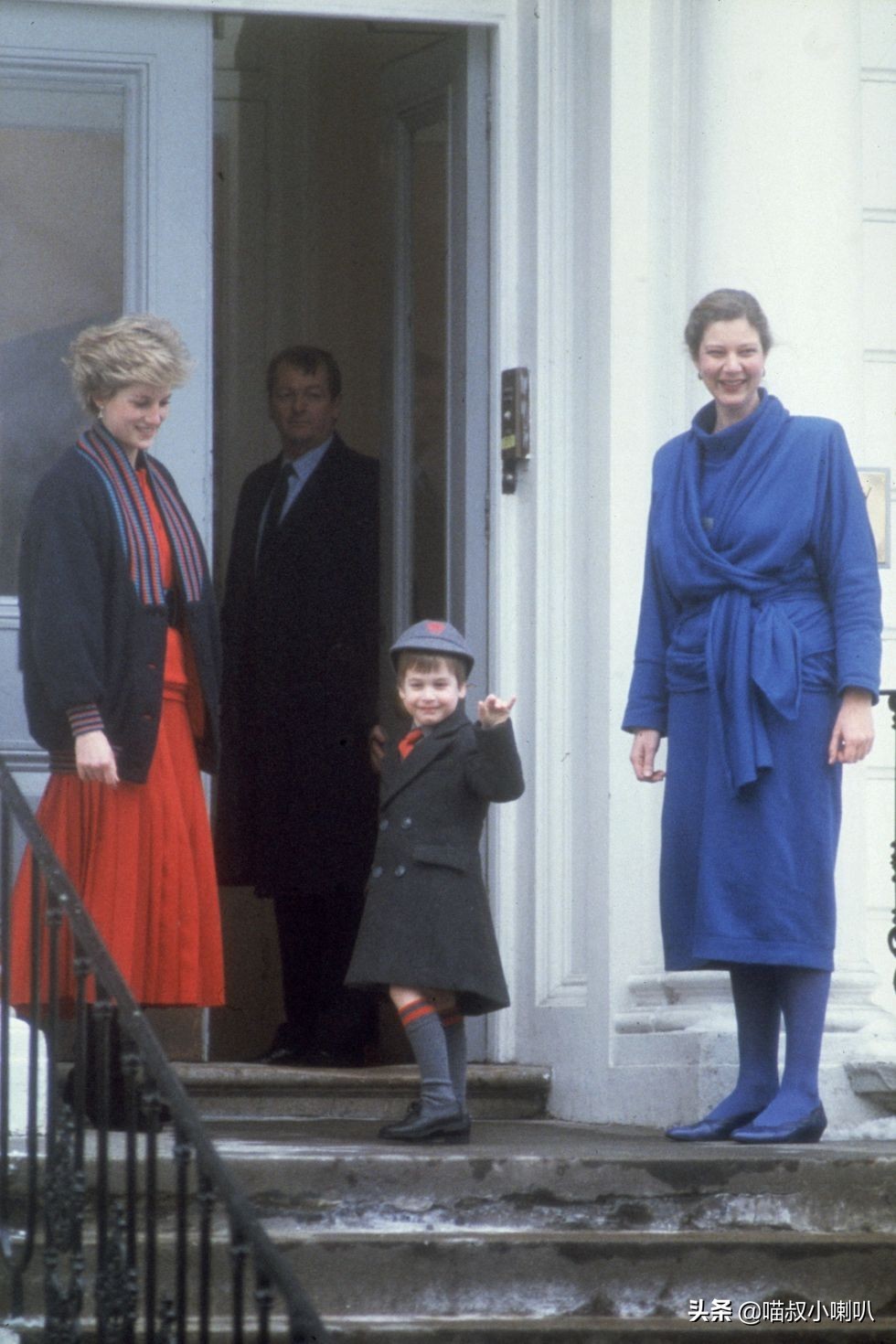 1987年,身穿制服的威廉王子在母亲慈爱的目光中,进入学龄前学校Wetherby School。