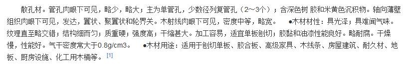 木材有光泽、无特殊气味。纹理黑白相间,直至浅交错,结构匀,耐腐、耐久性强、材质硬重、细腻,是一种十分稀少的珍贵家具及工艺品用材。