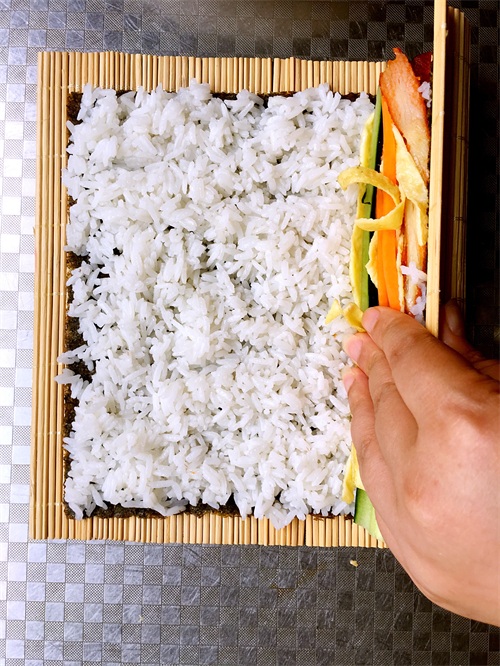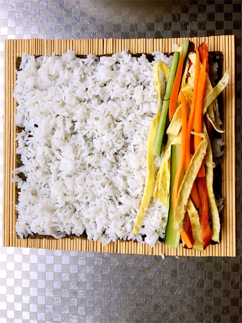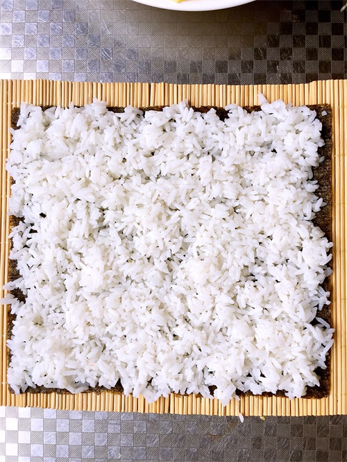 4、拿出海苔,糙面向上,把米饭铺在上面,把食材放在顶头一端,卷起来