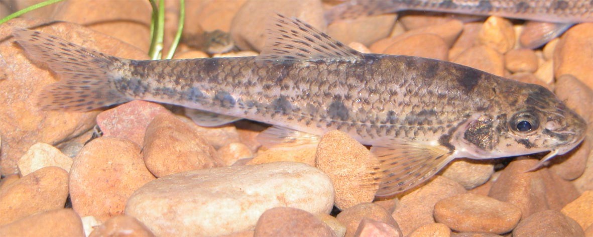 特性:棒花鱼,体粗壮。鼻孔前方下陷。唇厚,上唇的褶皱不显著;下唇侧叶光滑。侧线鳞35~39。生殖时期雄鱼胸鳍及头部均有珠星;各鳍延长。背部深黄褐色,至体侧逐渐转淡,腹部为淡黄色或乳白色,背部自背鳍起点至尾基有5个黑色大斑。在体侧有7—8个黑色大斑,此外在整个背部自头至尾不规则的散布有许多大小黑点,在背鳍、胸鳍及尾鳍上由小黑色斑点组成比较整齐的横纹数行,在生殖期体色转深,雄鱼更为明显。小型鱼类,生活在静水或流水的底层,主食无脊椎动物。1龄鱼性成熟,4~5月繁殖,在沙底掘坑为巢,产卵其中,雄鱼有筑巢和护巢的习性。体长可达11厘米,主要生活于平原河流水清以及沙底处。