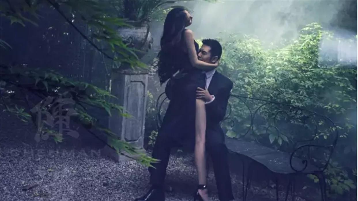 在这样一个背景里 杨颖身穿性感黑色连衣裙 勾勒出完美的身材曲线 而黄晓明把杨颖像个尤物一样抱在手里 让人血脉贲张 充斥着满满的荷尔蒙味道 和背景形成了鲜明的对比