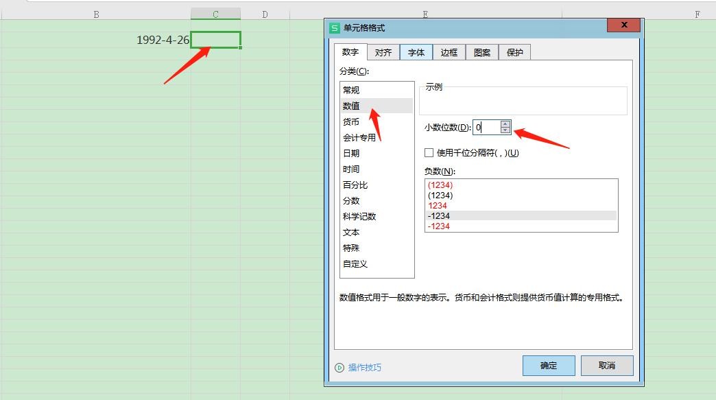 四、设置C列的单元格格式为数值,小数位数为零,点击确定