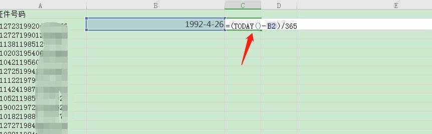 五、C列调整好单元格格式之后,输入公式=(TODAY()-B2)/365