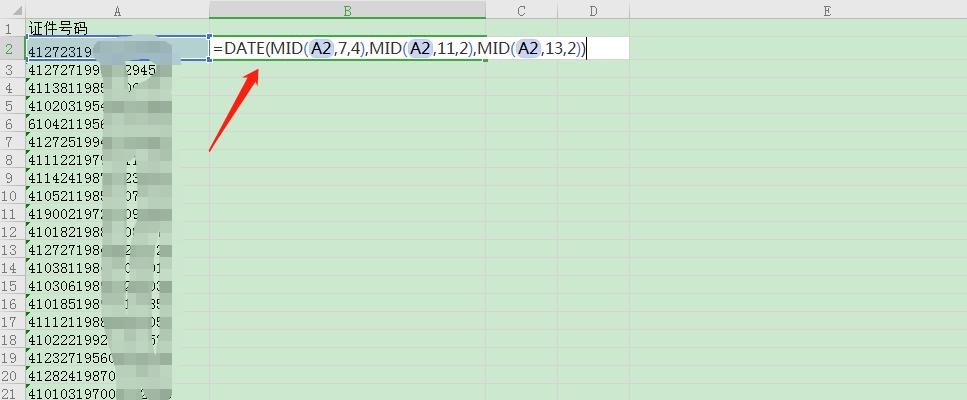 二、在B列输入公式:=DATE(MID(A2,7,4),MID(A2,11,2),MID(A2,13,2)),这样能快速提取A列中的年月日,如下图所示