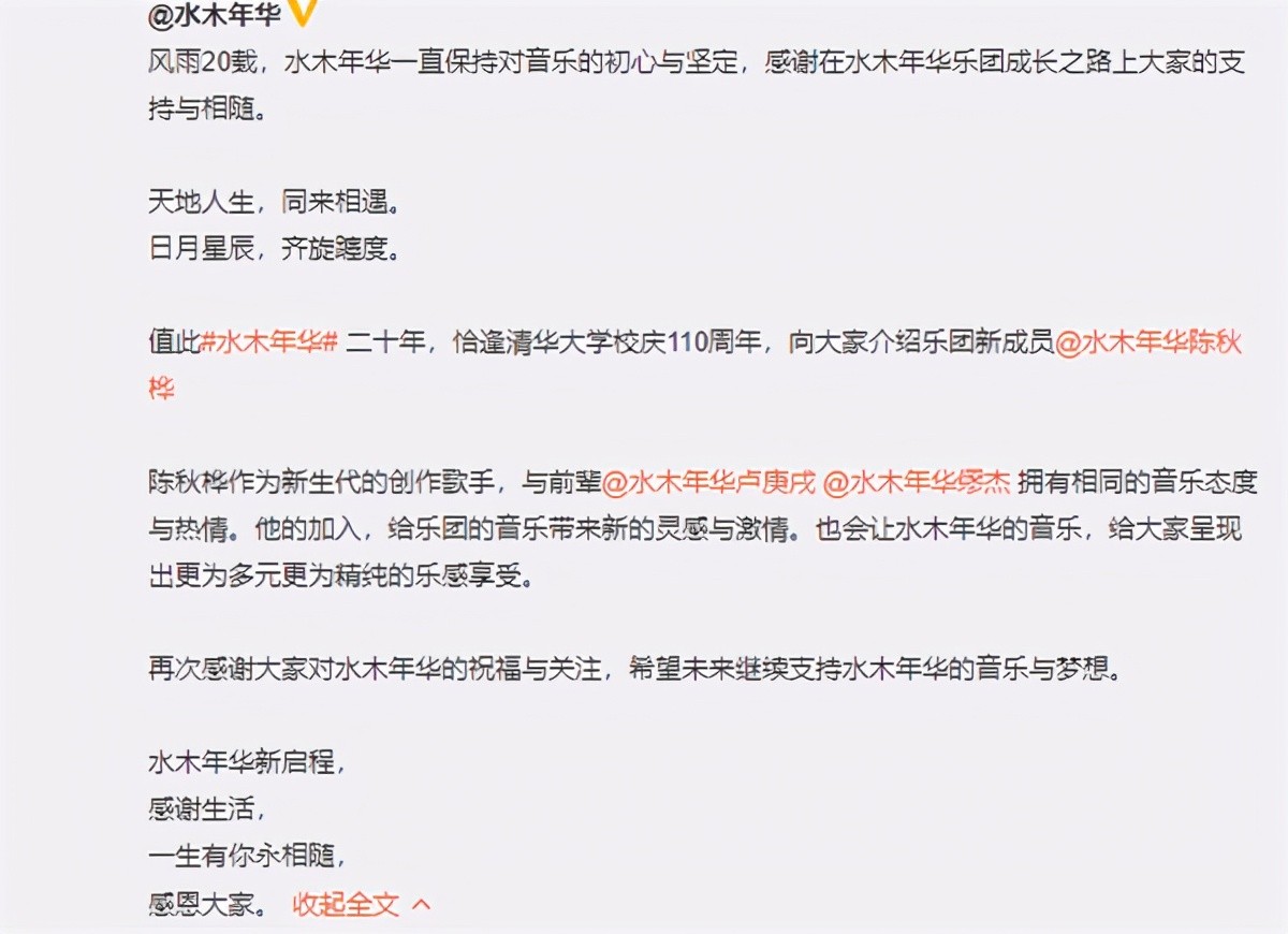 4月25日,歌唱组合“水木年华”官方在社交平台上发了一篇长文,宣布组合中再次添加了一名新成员陈秋桦。