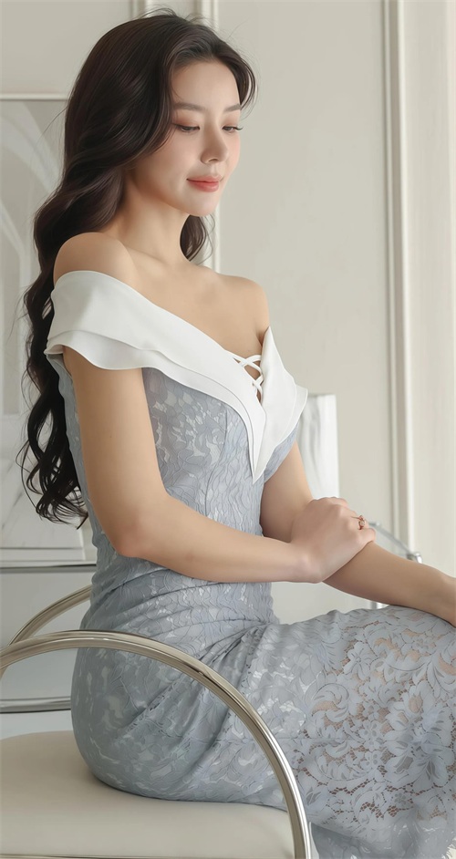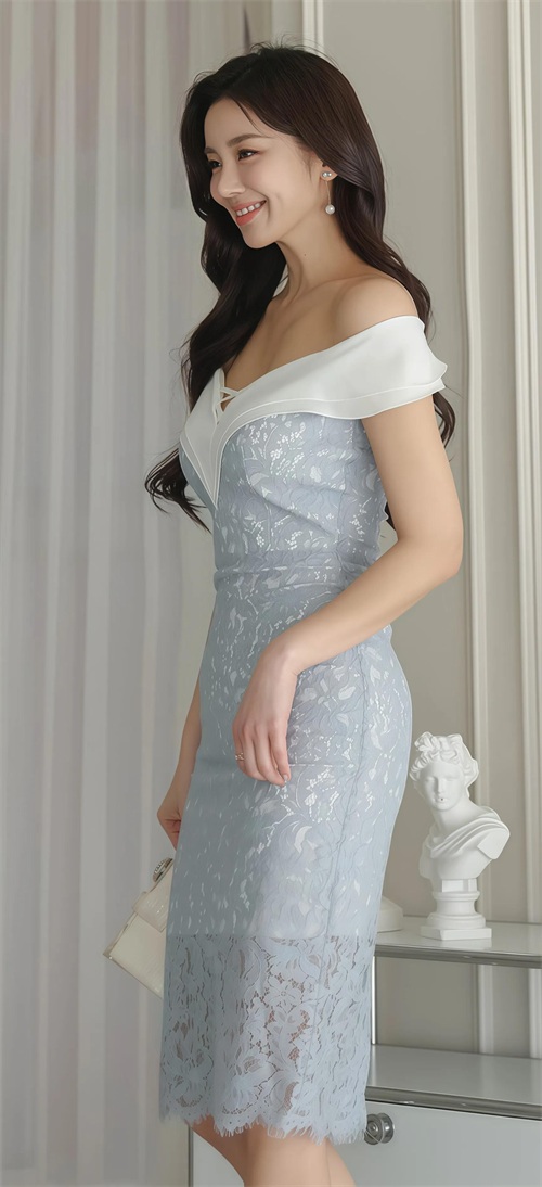 图中美女身着一袭优雅的浅蓝色蕾丝连衣裙,露肩设计搭配白色领口,尽显时尚与性感。她手持浅色手包,脚穿精致高跟鞋,站在室内环境中,整体造型优雅大方,彰显出高贵气质和独特魅力。