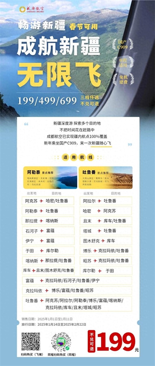 春节可用,不兑可退|¥199起成航新疆无限飞第二期开始啦