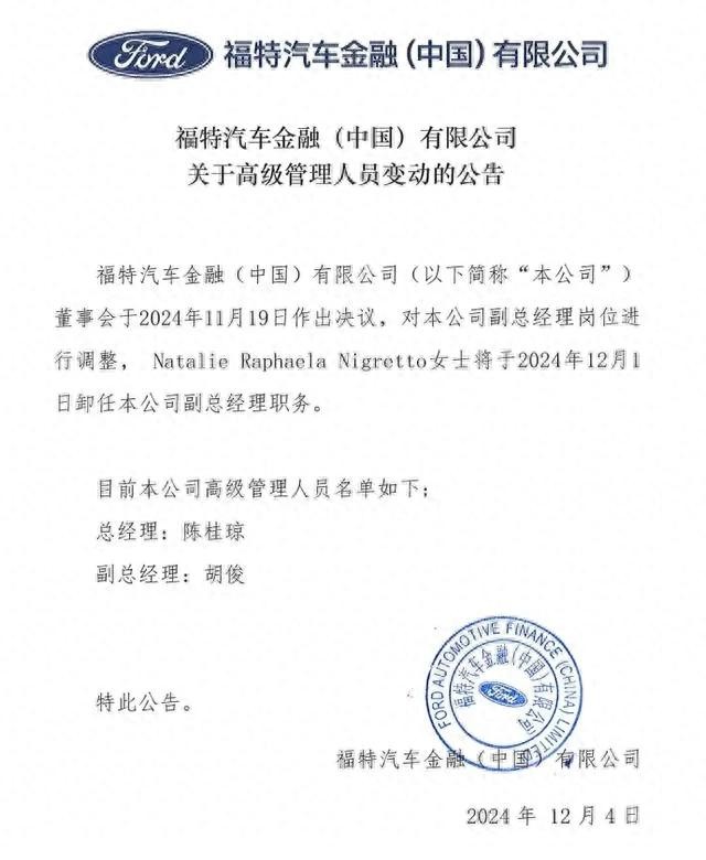 每经AI快讯,12月4日,福特汽车金融(中国)有限公司公告,董事会于2024年11月19日作出决议,对公司副总经理岗位进行调整,Natalie Raphaela Nigretto女士将于2024年12月1日卸任公司副总经理职务。