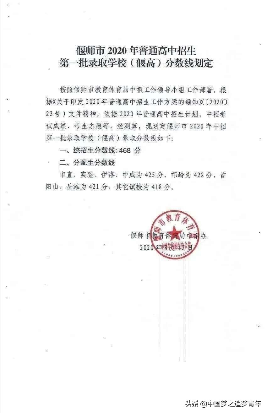 偃师市2020年普通高中招生第一批录取学校(偃高)分数线划定