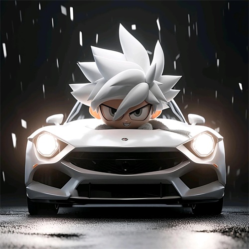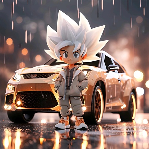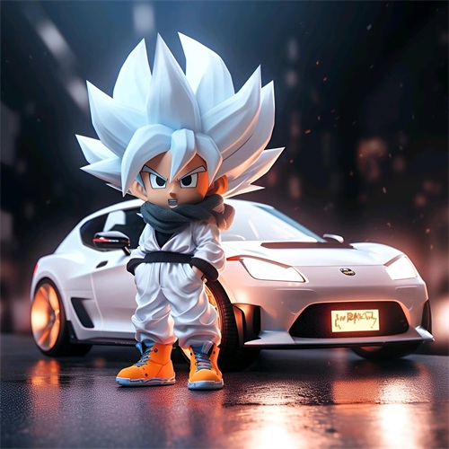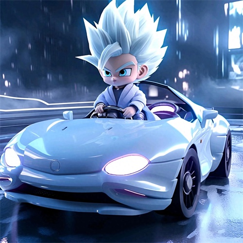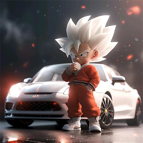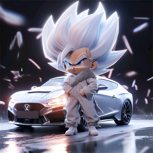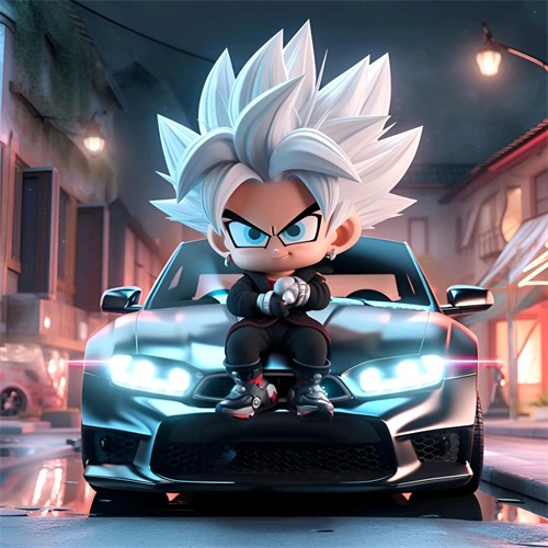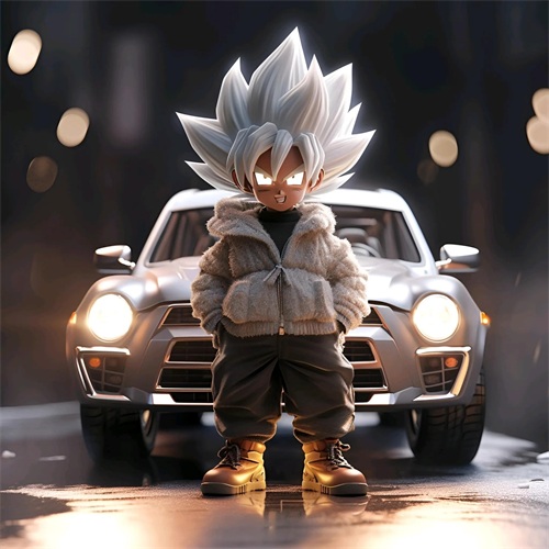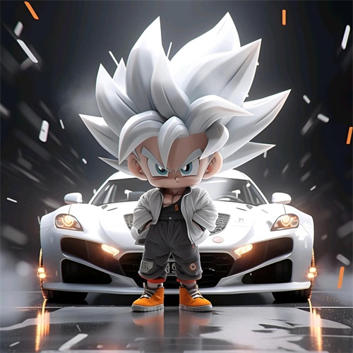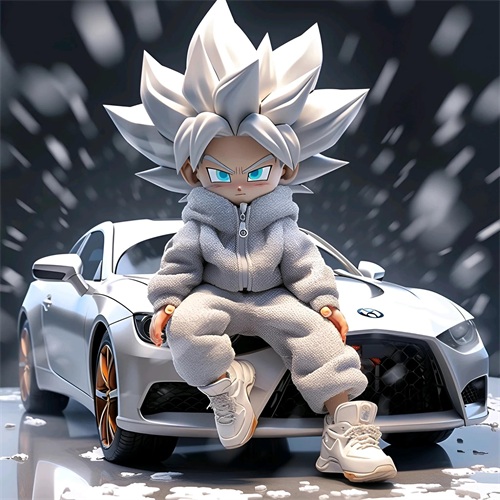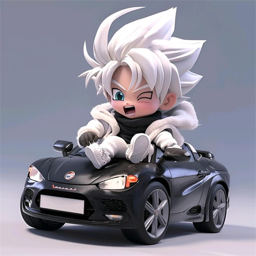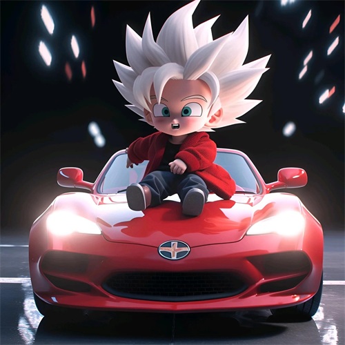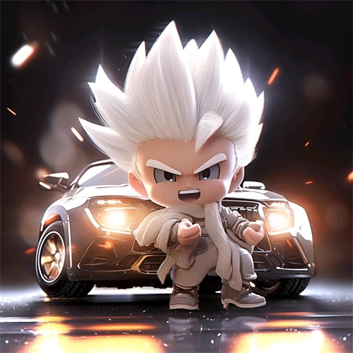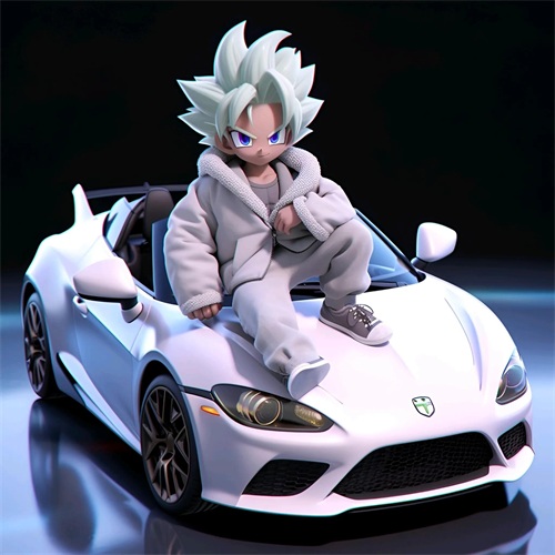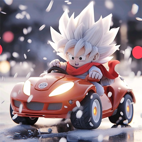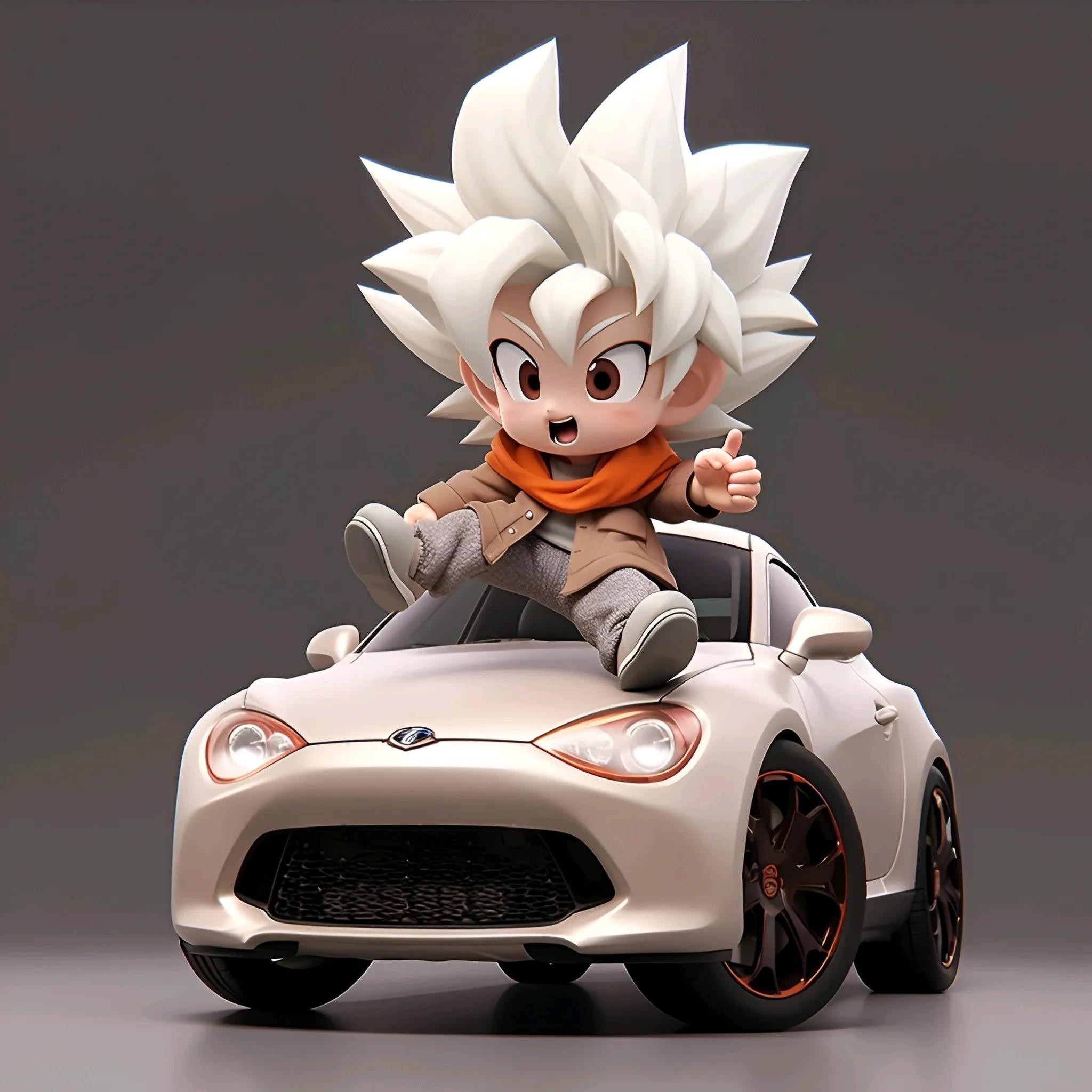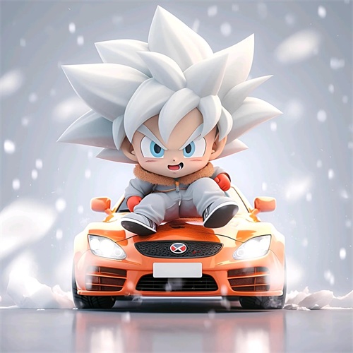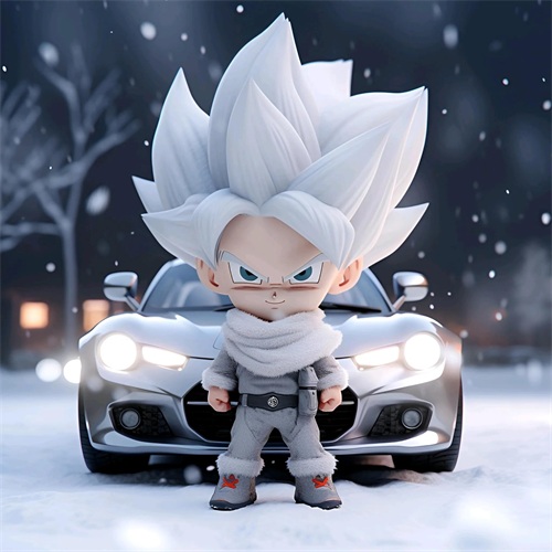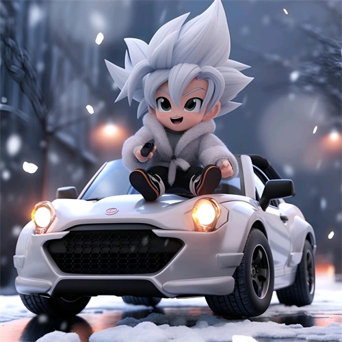 一个Q版的小超级赛亚人坐在超级开蓬跑车里,穿着羽绒服和超大的运动鞋。他的浅白色头发和发达的肌肉展示着他的酷和帅。在冬天的背景下,他的眼睛发光,充满了活力。他笑得非常开心,似乎正在享受这个美好的时刻。