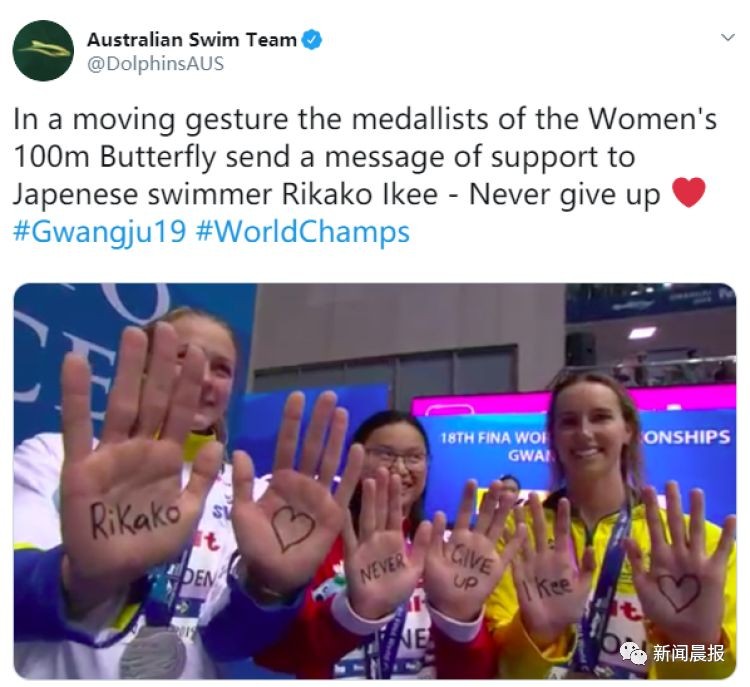 但一天过后,三位姑娘就给霍顿当了回榜样,在颁奖台上,她们在手心写下祝福语,为正在与白血病作斗争的日本选手池江璃花子加油。如此暖心的一幕,也引来了全场观众的欢呼。