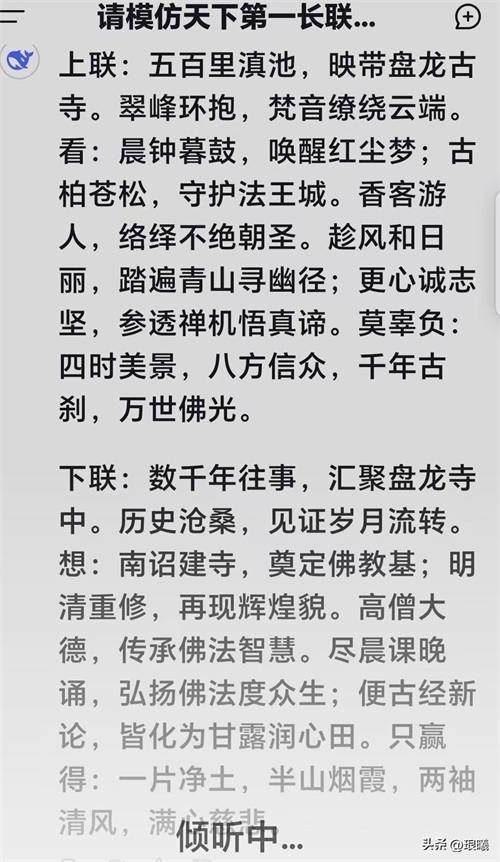 这是Deepseek模仿昆明大观楼长联,写的描绘昆明晋宁盘龙寺的一副长联,现分享给头条友友们,一起欣赏,感受那段沧桑岁月。