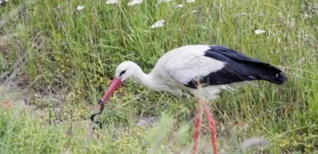 鹳作为鸟类,飞行中比较大的动物,人们为了描述它的高大威猛,总是会用鹤立鸡群来表达,不仅拥有很长的腿抓,还有比雄鹰更大的翅膀。最关键的是它那尖韧有力的长嘴,能瞬间攻击食物,琢得蛇不能动弹,只能眼睁睁看着自己被喝琢成肉来吃。