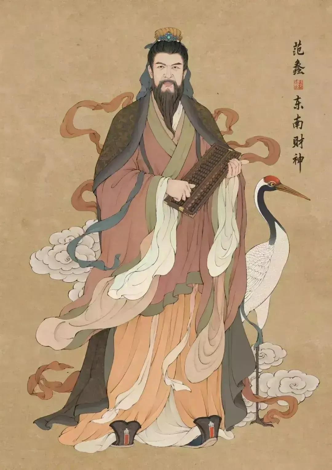 文财神,一个是比干,他是商朝的最负盛名的大忠臣,福禄寿中的禄即为比干。另外一位文财神就是范蠡。此外还有管仲、端木赐、白圭。