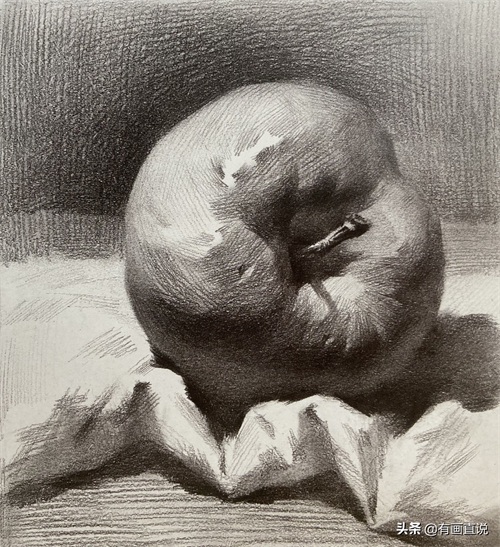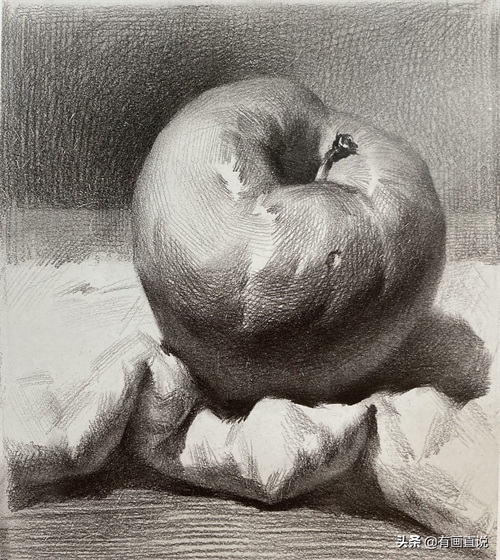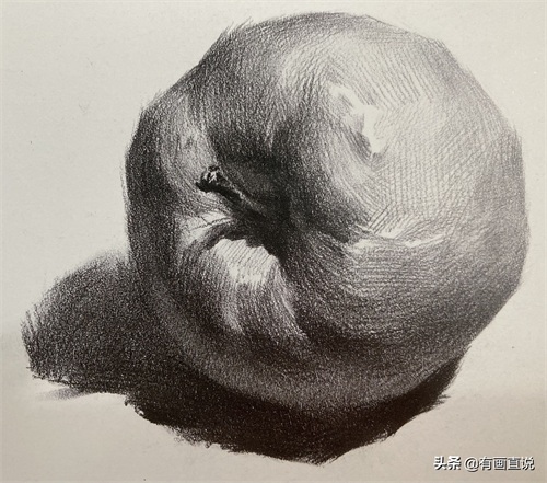 步骤4:深入刻画苹果的结构、形体、虚实变化,塑造苹果的体块感,围绕形体结构深入塑造。要注意物体固有色、 质感、光感、体量感和空间感的表现。(苹果窝部的塑造非常关键)