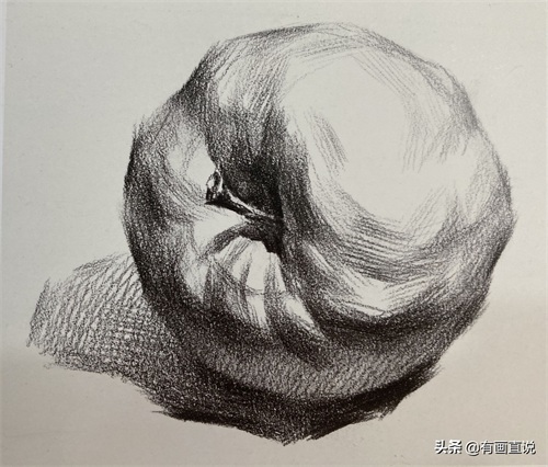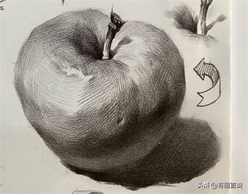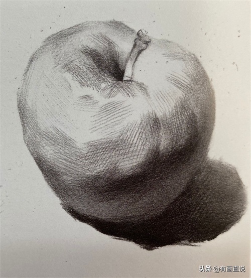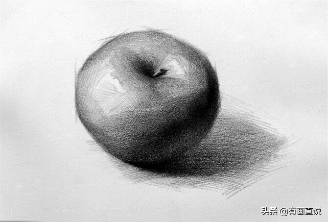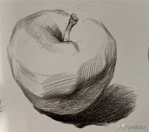 步骤2:找出苹果的明暗交界线以及投影的形状、位置、大小。注意线条的粗细、轻重、虚实变化(用笔的侧锋去画)。用斜排线统一画出苹果的暗面,让画面产生基本的明暗关系。