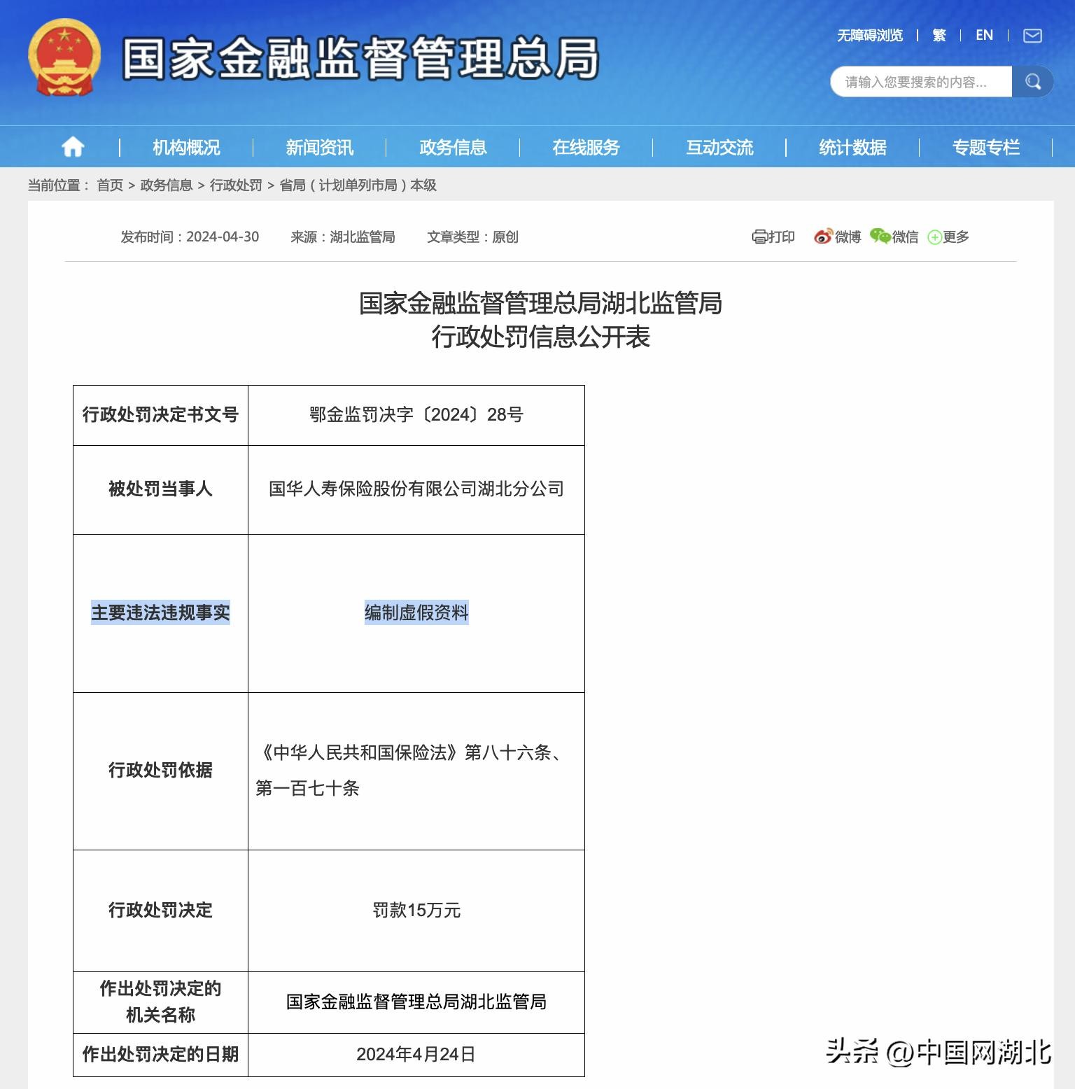 值得注意的是,仅在一个月前,国华人寿张家口中心支公司刚被罚款15万元,同样是因为编制、提供虚假报表、资料(廊金罚决字[2024]3号)。