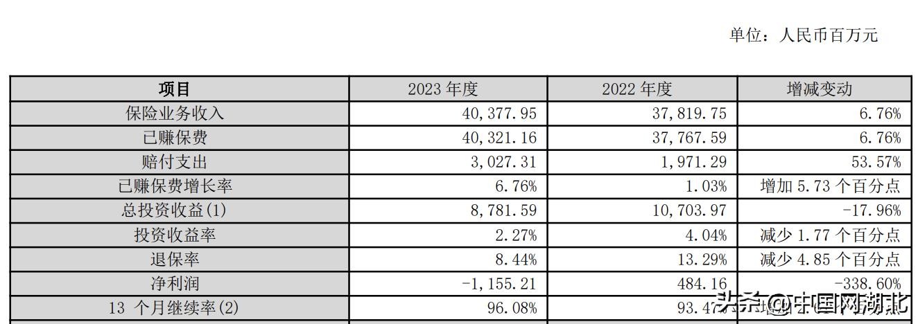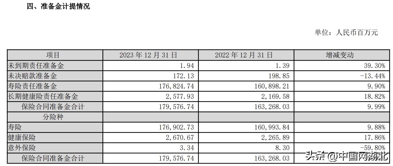 2023年12月31日,公司保险合同准备金余额1,795.77亿元,较2022年12月31日增长9.99%。其中,未决赔款准备金1.72亿元,下降13.44%,主要是因为已发生已报告未决赔付款减少;寿险责任准备金1,768.25亿元,增长9.90%,长期健康险责任准备金25.78亿元,增长18.82%,是因为公司业务规模的扩大和保险责任的累积所致。