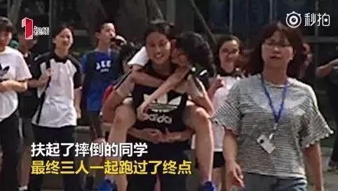 10日,四川成都某中学举行2018年初升高体考,在800米项目中,谭雨乔同学不慎摔倒,魏子悦和牟思瑾发现后,毫不犹豫折返将她拉起,最终三人一起跑过终点。二人说,想到她就此影响成绩,肯定很遗憾。